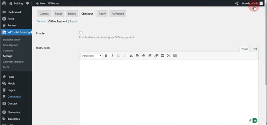 To manage your payment methods, head back to WP Hotel Booking » Settings » Checkout.